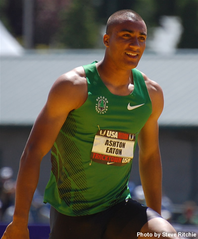 DAEGU, SOUTH KOREA – After day one of the decathlon at the IAAF championships here, Bend native Ashton Eaton finds himself in a pitched battle for the gold medal. Eaton scored 4446 points to lead defending world champion Trey Hardee by 53 points. Oleksiy Kasyanov of the Ukraine is within striking distance in third with 4310 points.