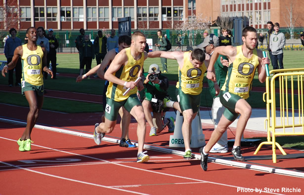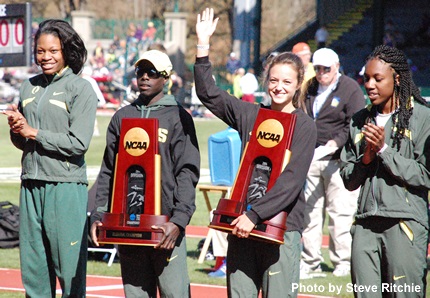 The NCAA title for the UO women was secured in dramatic fashion in the 4 x 400 relay. Going into the relay, the Ducks trailed Texas by 1.5 points, and Oregon was chasing Texas on the final leg of the relay. Anchor Phyllis